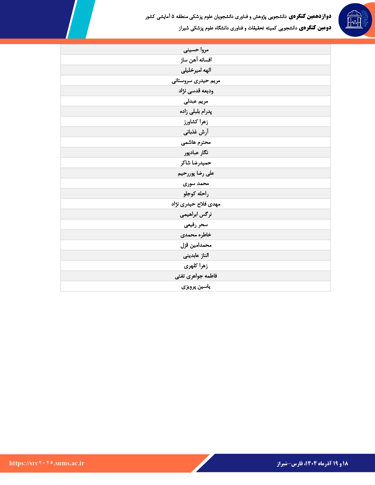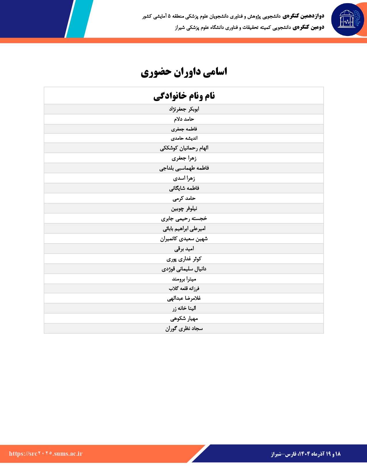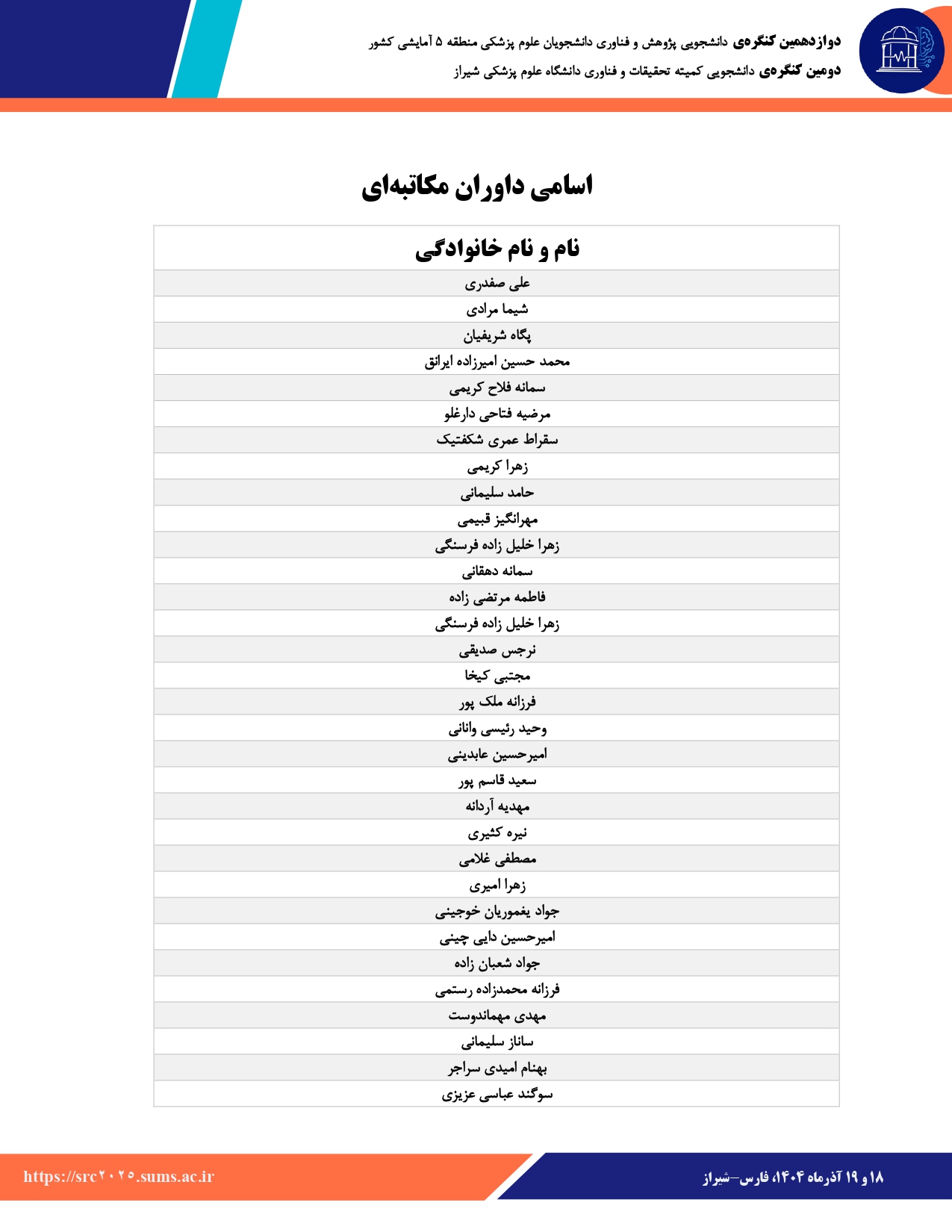 به اطلاع همراهان گرامی دوازدهمین کنگره پژوهش و فناوری دانشجویان علومپزشکی منطقه ۵ آمایشی کشور و دومین کنگره کمیته تحقیقات و فناوری دانشجویی دانشگاه علکم پزشکی شیراز میرسانیم، اسامی داوران مکاتبهای و حضوری اعلام شد.